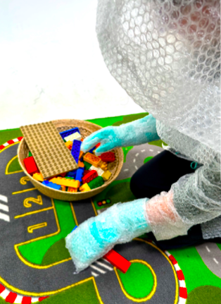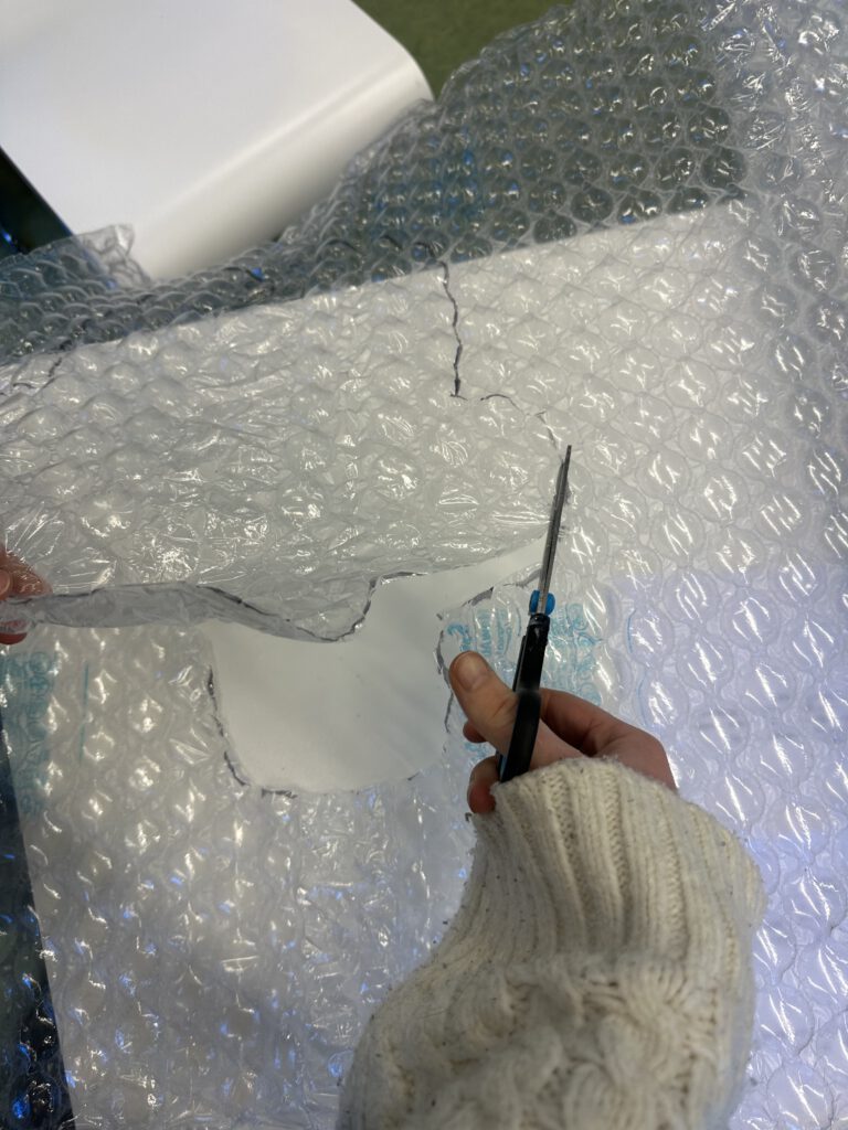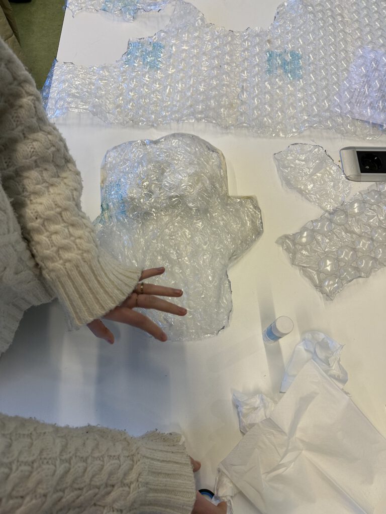 Het bubbeltjes pak is geheel gemaakt van bubbeltjesplastic, hiervoor hebben wij verschillende iteraties gedaan voordat wij al het materiaal hebben verwerkt tot een heel pak!